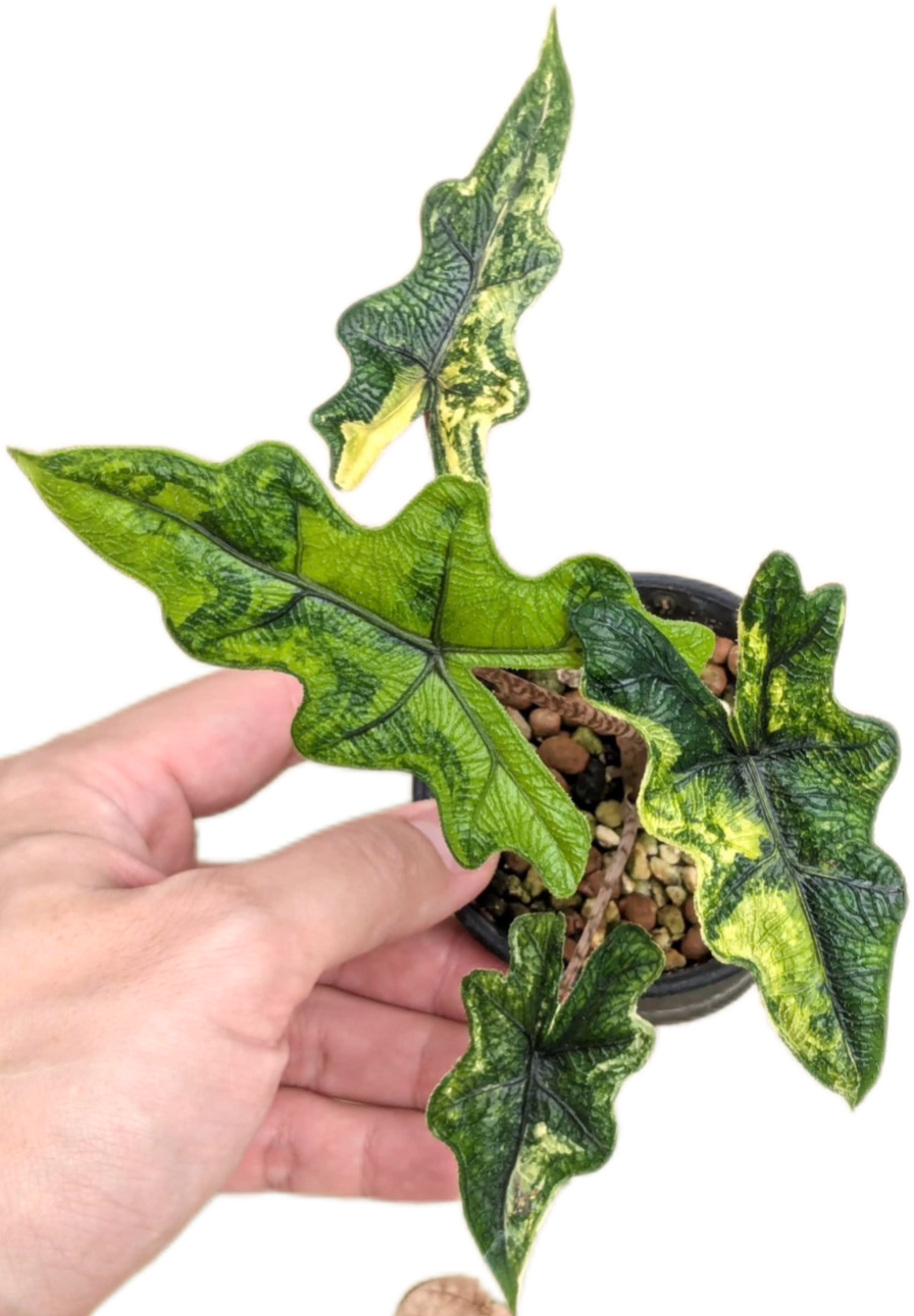 Alocasia Jacklyn 'Aurea Variegata' features distinctive oak leaf-shaped foliage with beautiful golden-yellow variegation patterns on a deep green base. Each leaf displays unique marbling and sectoral variegation, creating a bright chartreuse to lime contrast. The plants shown are young specimens growing in small nursery pots with well-draining soil mix, showcasing multiple variegated leaves on slender stems. This rare aurea form adds a vibrant golden touch to the already unique Jacklyn variety known for its deeply lobed leaves.