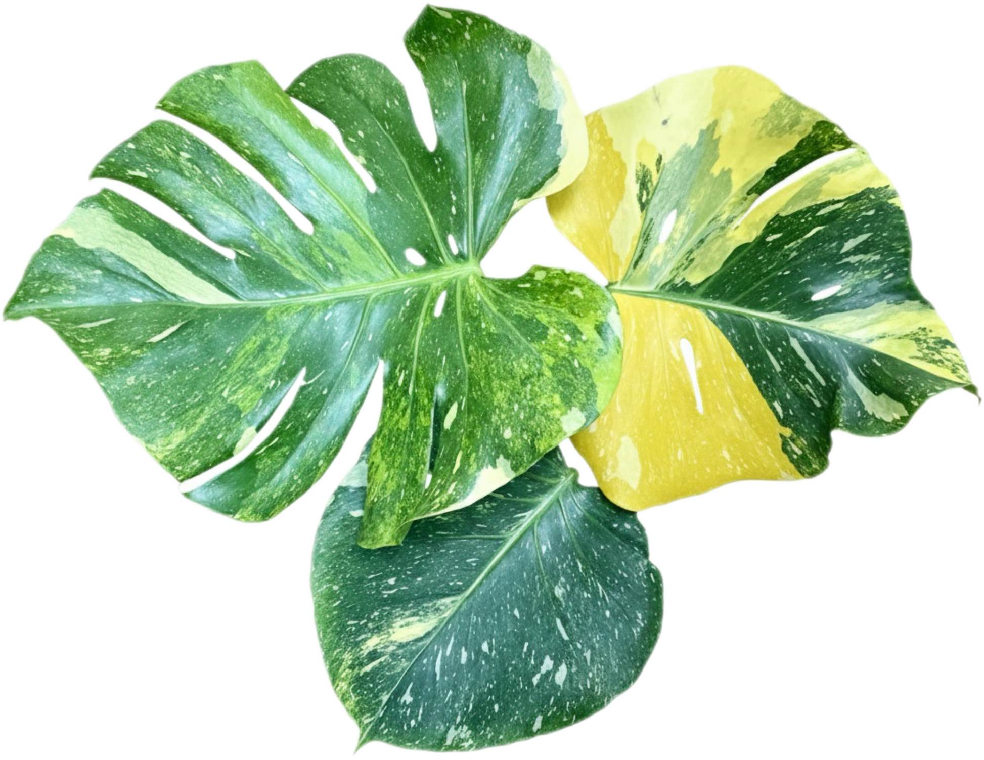 Monstera Deliciosa Tricolor (Miracle) A rare and breathtaking variety, this Monstera Deliciosa features stunning tricolor variegation with vibrant green, creamy white, and golden-yellow hues. Its unique pattern on each leaf adds an artistic touch, making it a prized addition for any collector or plant lover.