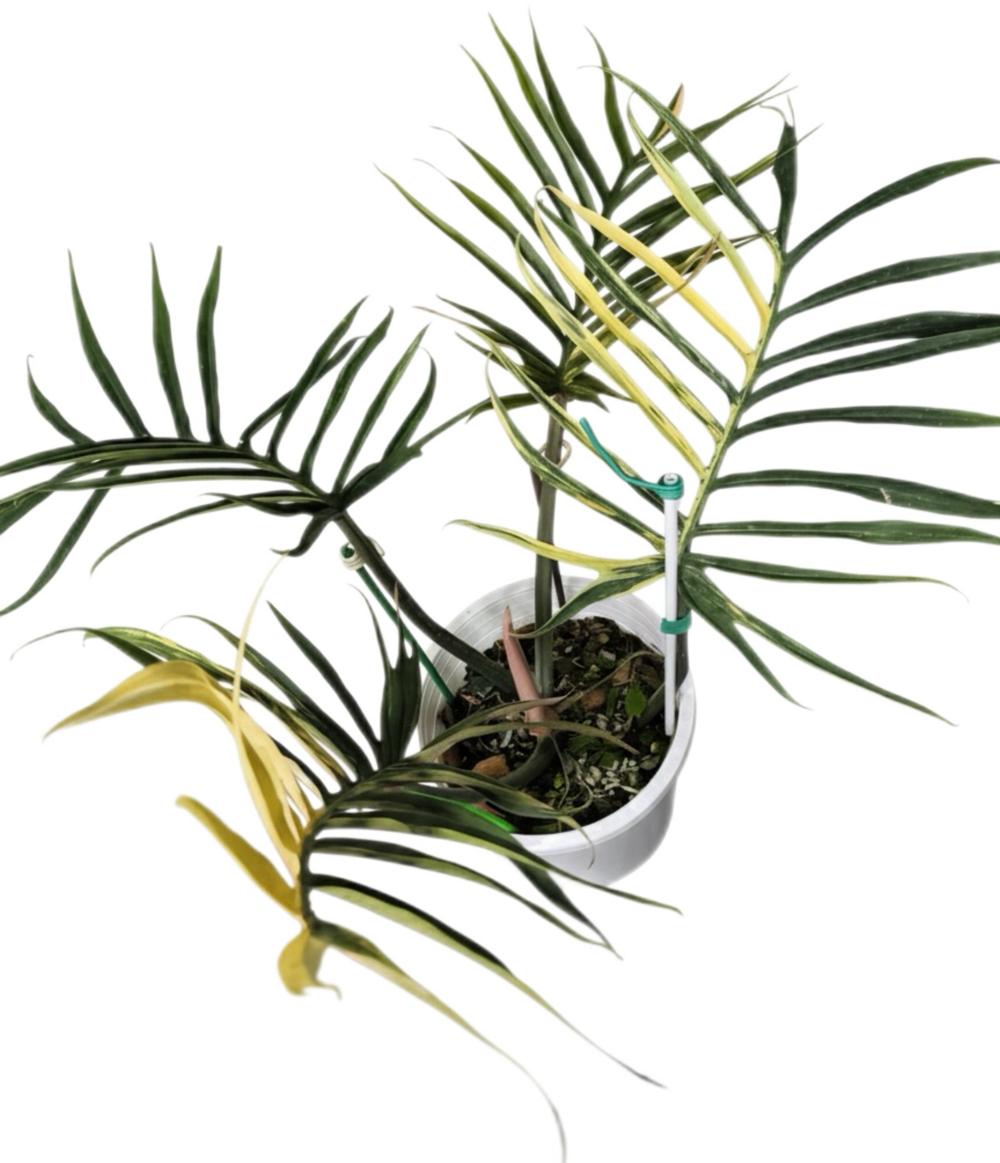 Philodendron Tortum Variegated - Rare collector's specimen featuring deeply divided, feather-like leaves with stunning variegation in yellow-cream and green. Each leaf shows intricate finger-like divisions characteristic of Tortum, enhanced by the unique variegation pattern. A highly sought-after variety combining the dramatic skeletal form with beautiful color variation.
