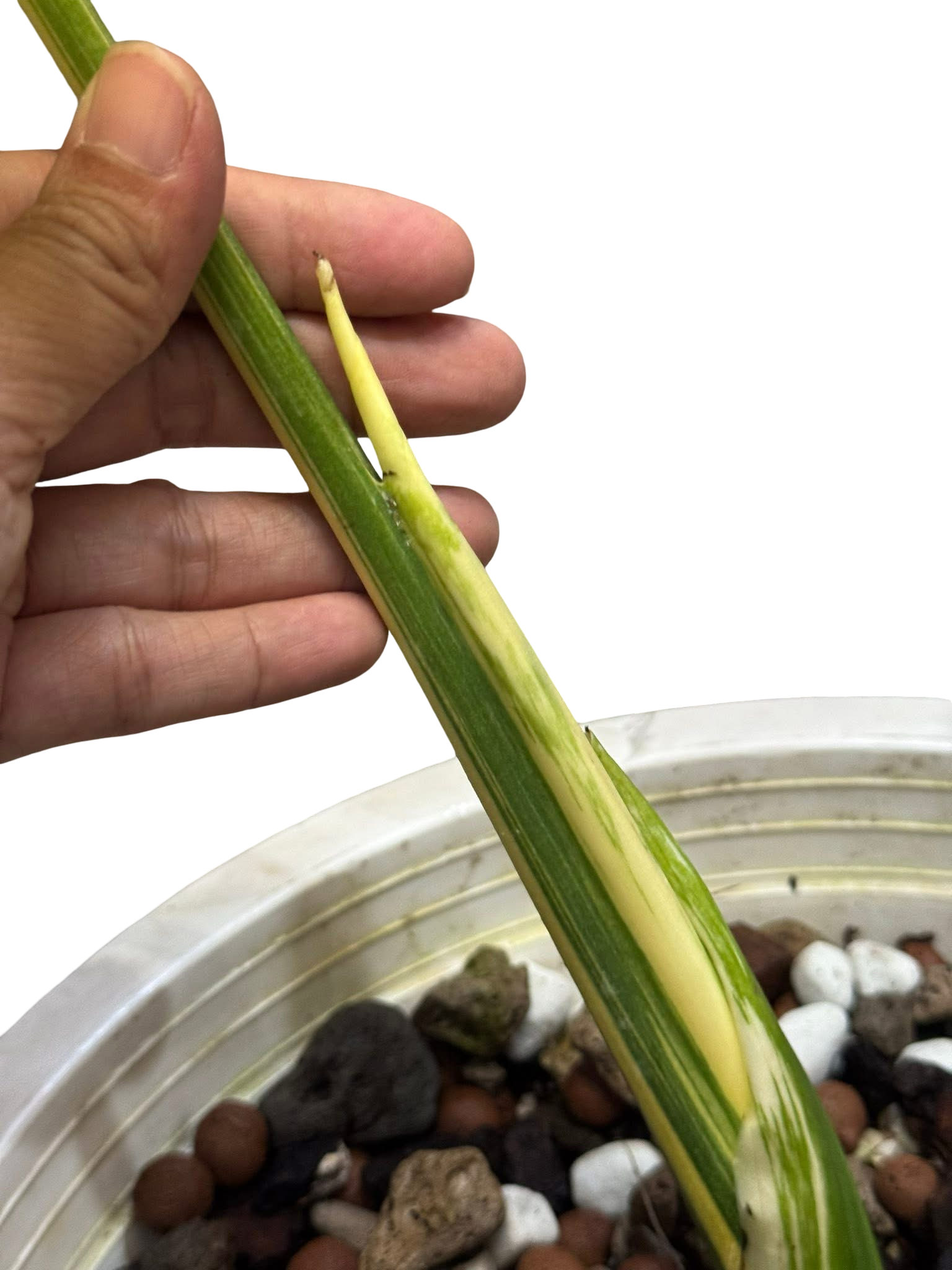 This actual plant showcases stable variegation with strong marbling, healthy roots, and an emerging new leaf showing continued variegation. The combination of color intensity and bold fenestrations makes it a true collector’s centerpiece.