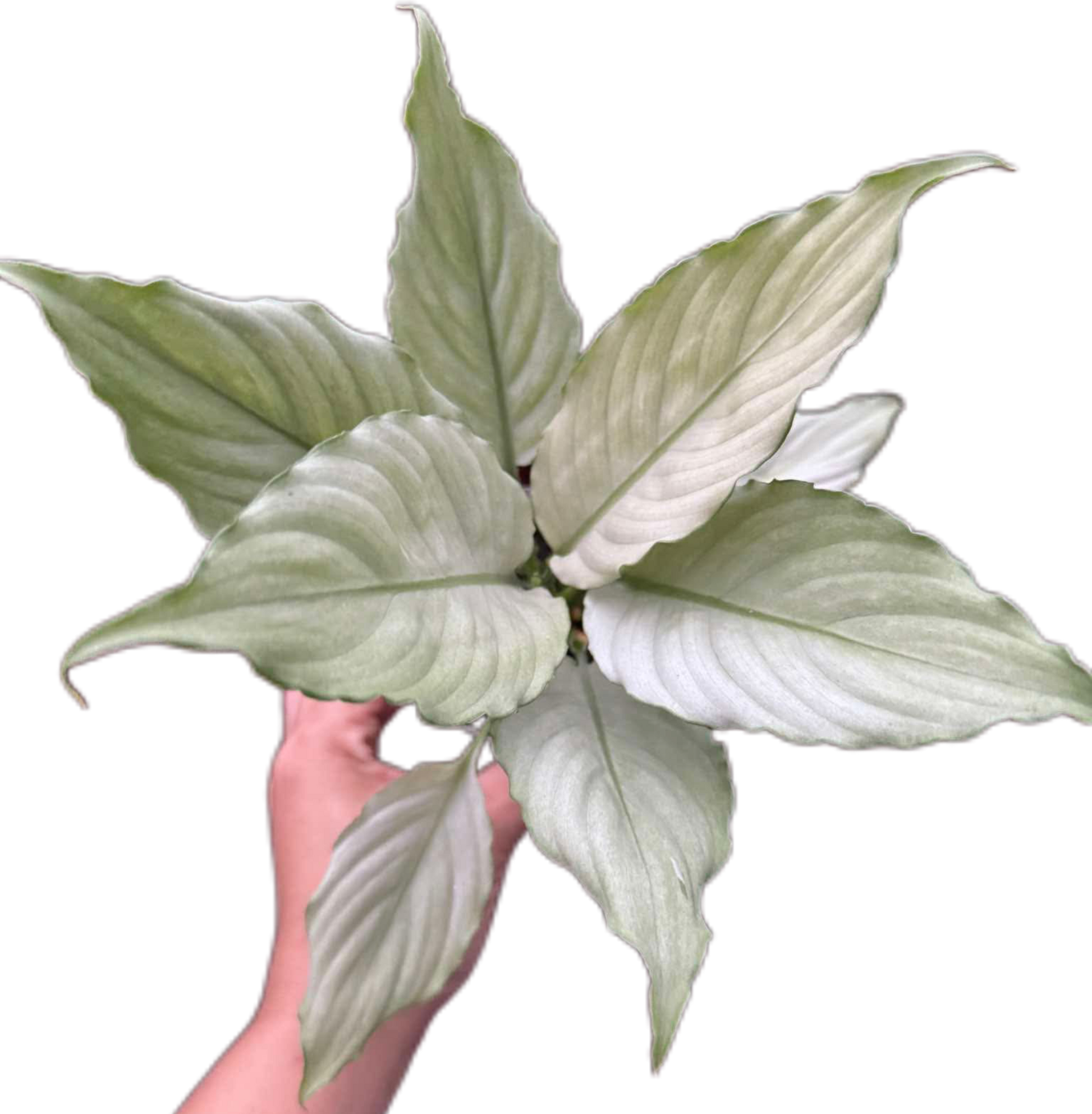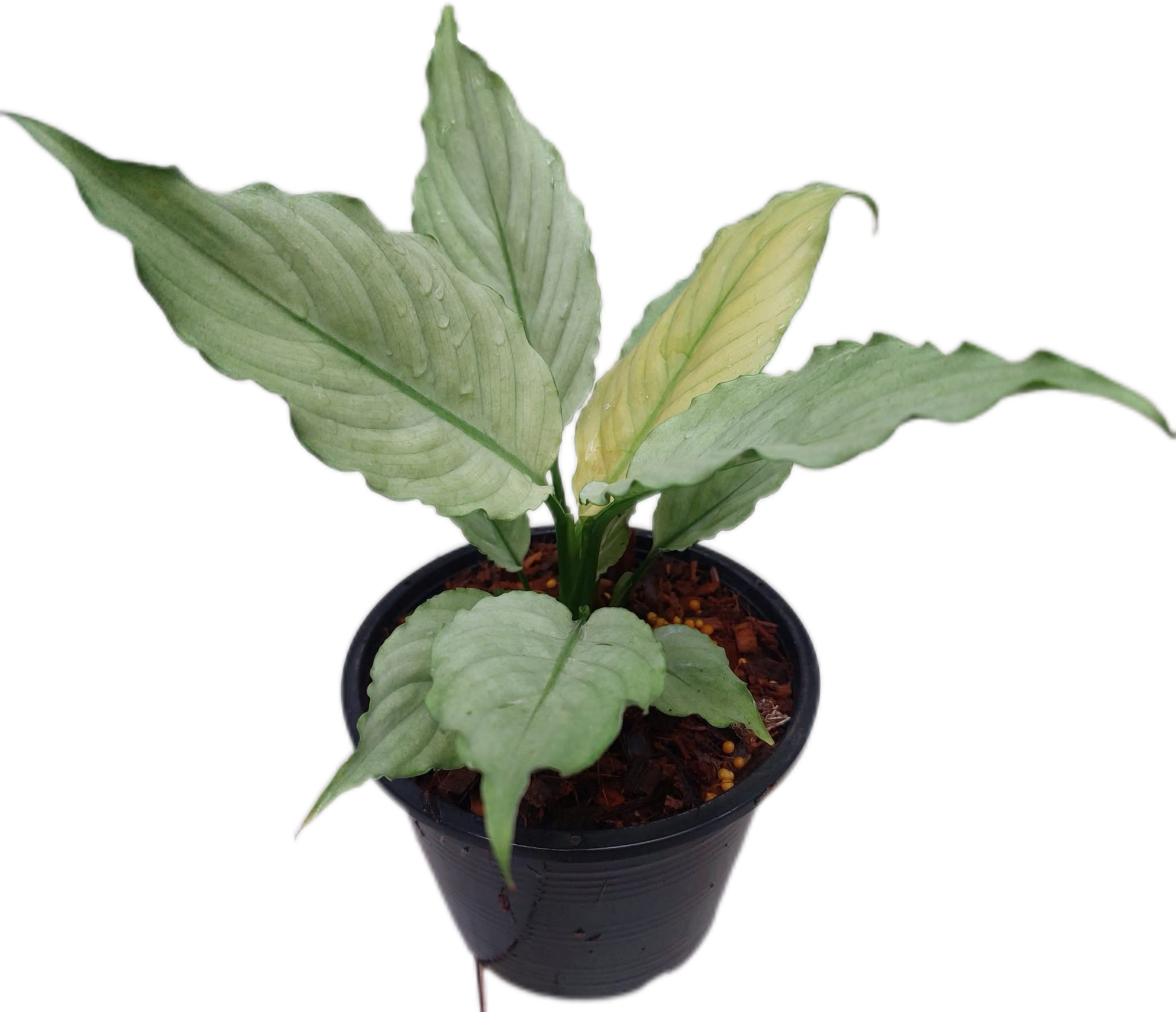 The Spathiphyllum “Grey Ghost” is a rare and striking cultivar of the Peace Lily, admired for its unique silvery-green foliage that gives a soft, ghost-like glow. Unlike traditional green Peace Lilies, this cultivar features pale, shimmering leaves with elegant rippled textures, making it a true collector’s gem.