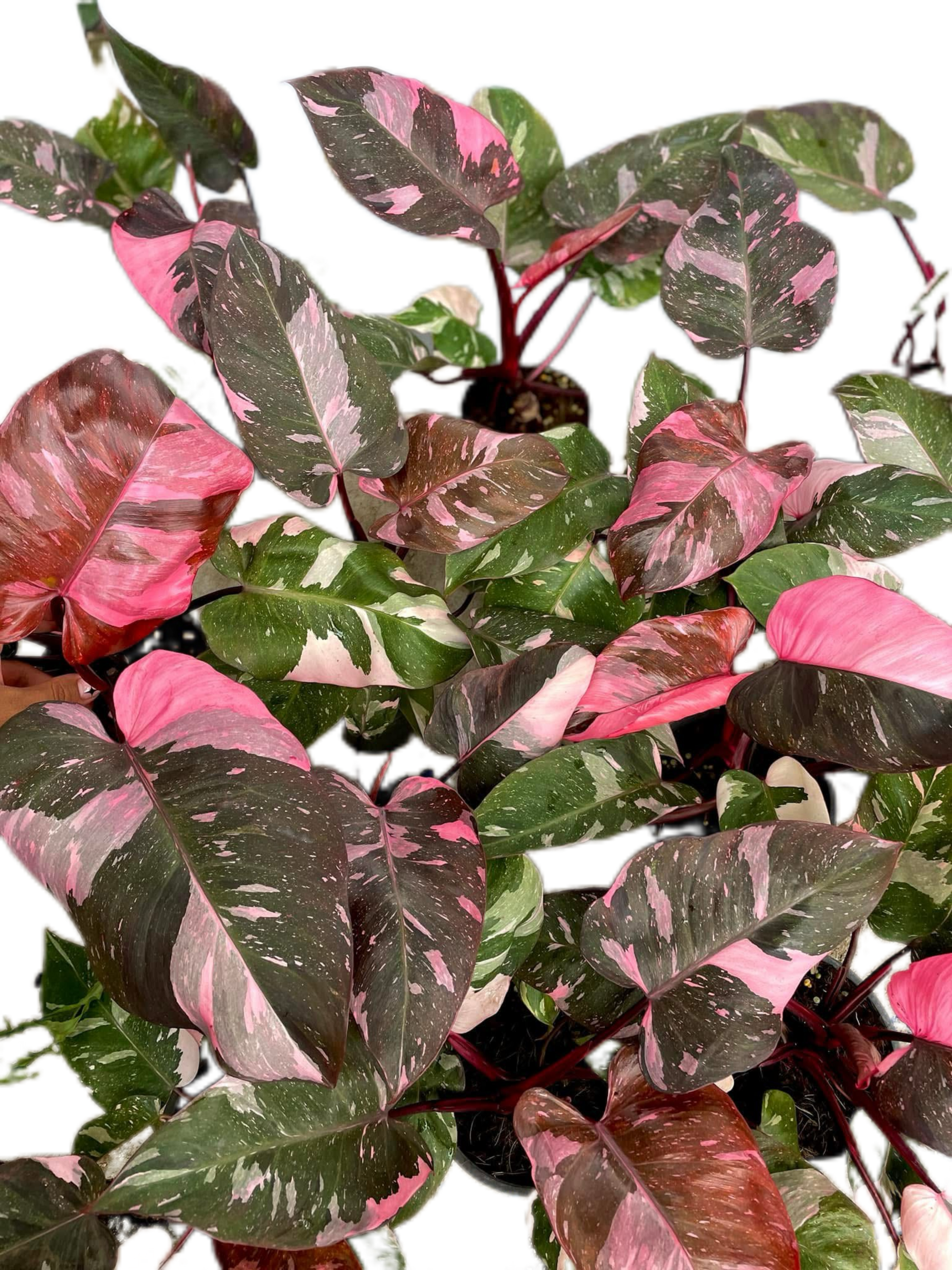 The Philodendron Pink Princess King Marble is a stunning variegated variety featuring heart-shaped leaves with dramatic pink, burgundy, and dark green marbling patterns. Each leaf displays unique splashes and sectors of bright pink variegation against deep green, creating an eye-catching contrast. The plants show healthy growth with burgundy stems and multiple variegated leaves. This cultivar is particularly special due to its high degree of pink coloration and marble-like variegation pattern, making it a prized addition to rare philodendron collections.