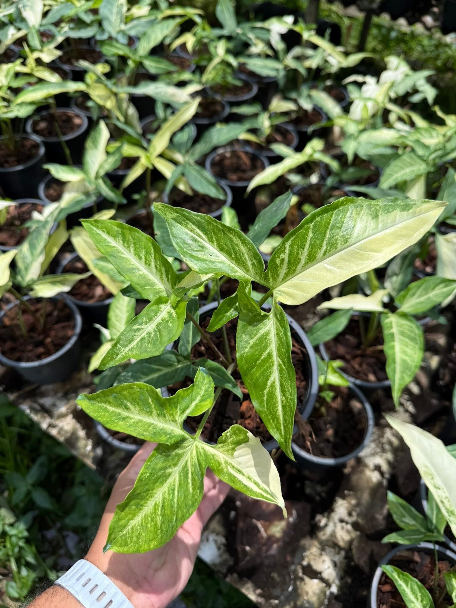 The Syngonium Angustatum Variegated is a rare and elegant arrowhead plant variety with long, slender leaves beautifully marbled in shades of green and creamy white. Its elongated foliage and striking variegation make it stand out among Syngonium collections. Easy to grow and adaptable, this plant thrives in both pots and hanging baskets, making it a versatile choice for homes, offices, and greenhouses. Highly sought after by collectors and plant shops alike, this wholesale set of 5 plants is ideal for nurseries, resellers, or bulk buyers looking to stock unique variegated tropical plants.